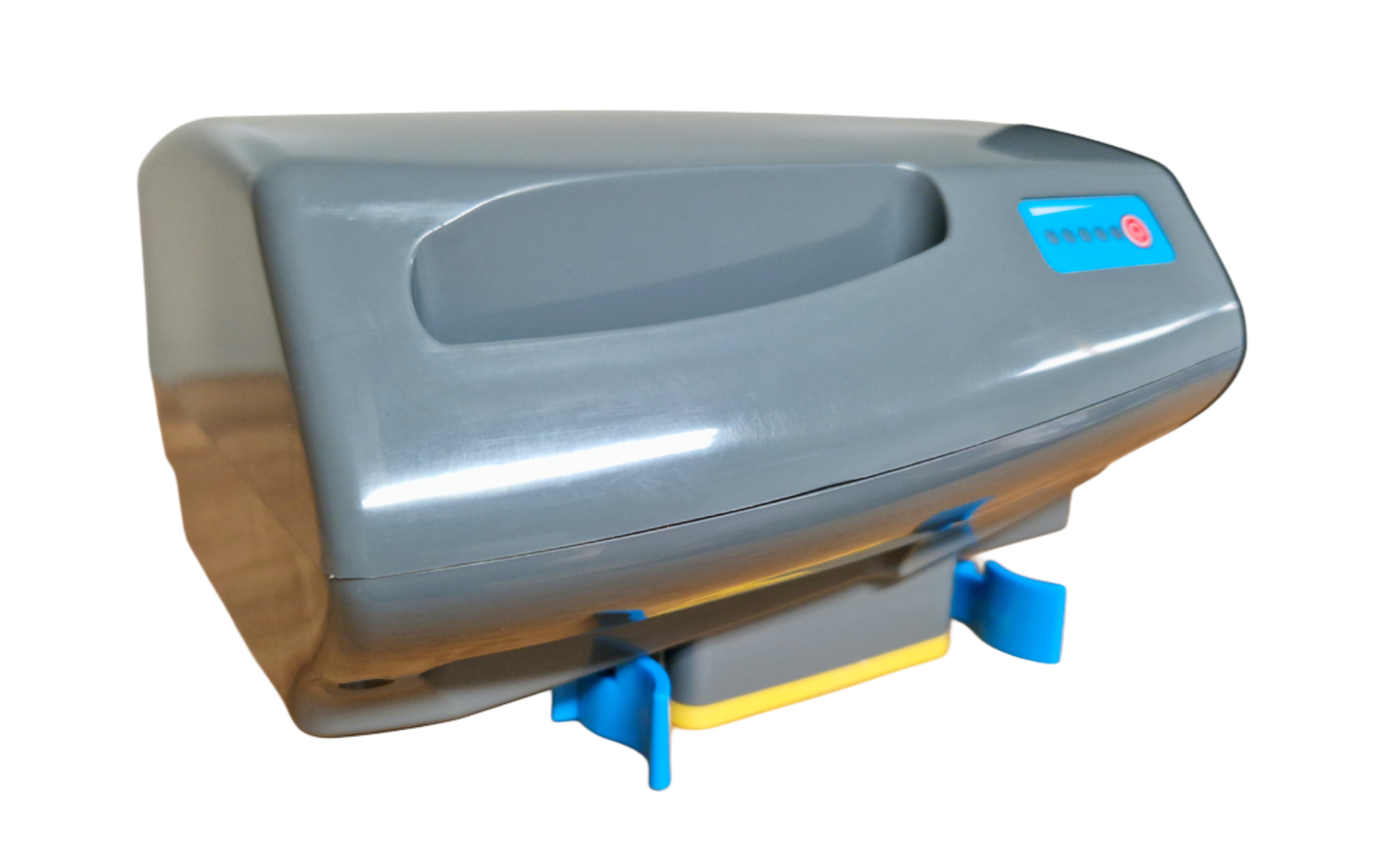 Graues Gehäuse mit gelber Unterseite und blauen Verriegelungsclips.